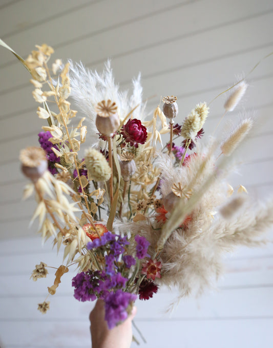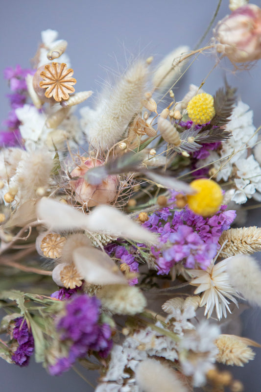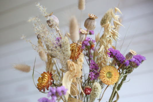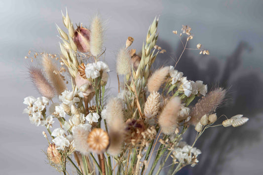 Jeder Trockenblumenstrauss wird von Hand arrangiert und besteht aus einer ausgewählten Vielfalt von Blumen wie Lagurus, Statice, Strohblumen und Pampasgras. Diese Kombination sorgt für einen einzigartigen Look, der perfekt in jedes Zuhause passt – ob modern oder rustikal. Die Sträusse benötigen keine Pflege, kein Wasser und sind eine nachhaltige Alternative zu frischen Blumen.